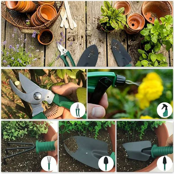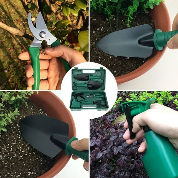 1 x Tuingereedschapsset met opbergdoos: 1 x wiedeklauw/hark, 2 x plantlepels, 1 x snoeischaar, 1 x verstuiver.