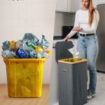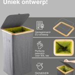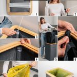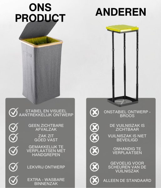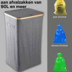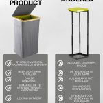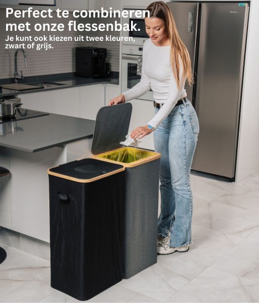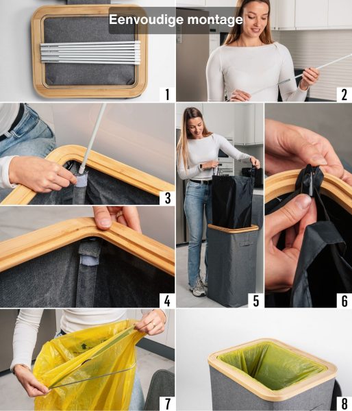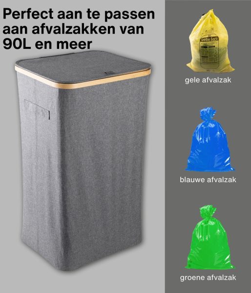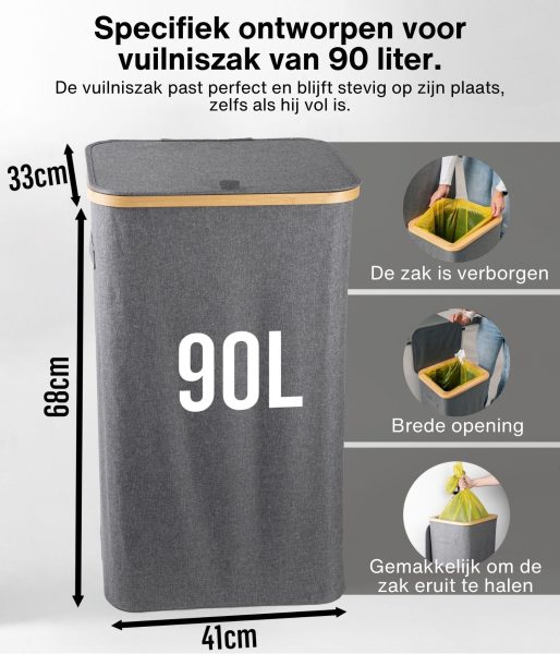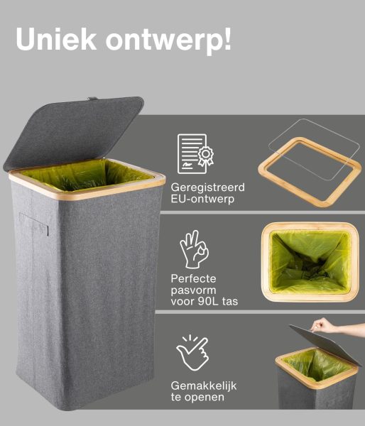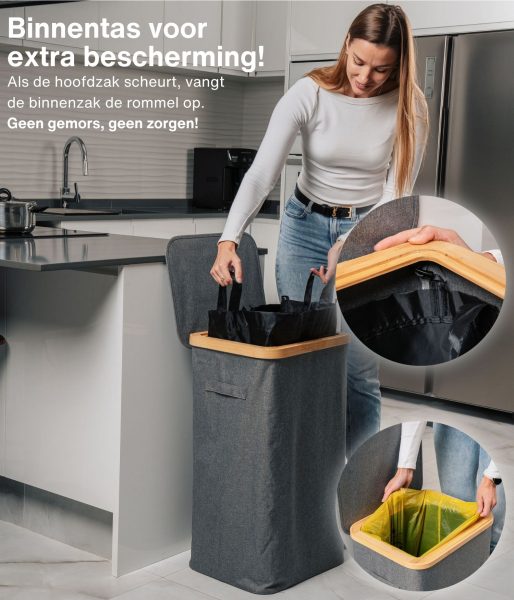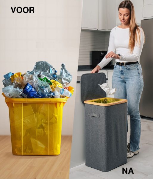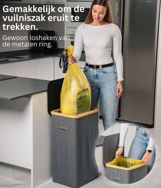 Dit model heeft versterkte naden, duurzame materialen en een esthetisch verfijnde grijze kleur die naadloos past in elke ruimte – of het nu een modern kantoor of een minimalistische keuken is. Het compacte maar ruime ontwerp maakt efficiënt recyclen mogelijk zonder veel ruimte in te nemen. Bovendien heeft de afvalemmer een bamboe frame met een ijzeren ring waaraan de afvalzak is bevestigd, waardoor deze eenvoudig te verwisselen en te gebruiken is. De afvalemmer is ontworpen voor afvalzakken van 90 liter, maar je kunt gemakkelijk grotere zakken gebruiken.