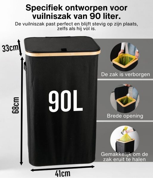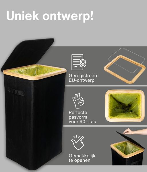 Dit model heeft versterkte naden, duurzame materialen en een esthetisch verfijnde zwarte kleur die naadloos in elke ruimte past – of het nu een modern kantoor of een minimalistische keuken is. Het compacte maar ruime ontwerp maakt efficiënt recyclen mogelijk zonder al te veel ruimte in beslag te nemen. Bovendien heeft de afvalemmer een bamboe frame met een ijzeren ring waaraan de afvalzak is bevestigd, waardoor deze eenvoudig te verwisselen en te gebruiken is. De afvalemmer is ontworpen voor afvalzakken van 90 liter, maar je kunt gemakkelijk grotere afvalzakken gebruiken.