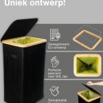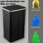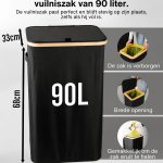 Dit model heeft versterkte naden, duurzame materialen en een esthetisch verfijnde zwarte kleur die naadloos in elke ruimte past – of het nu een modern kantoor of een minimalistische keuken is. Het compacte maar ruime ontwerp maakt efficiënt recyclen mogelijk zonder al te veel ruimte in beslag te nemen. Bovendien heeft de afvalemmer een bamboe frame met een ijzeren ring waaraan de afvalzak is bevestigd, waardoor deze eenvoudig te verwisselen en te gebruiken is. De afvalemmer is ontworpen voor afvalzakken van 90 liter, maar je kunt gemakkelijk grotere afvalzakken gebruiken.