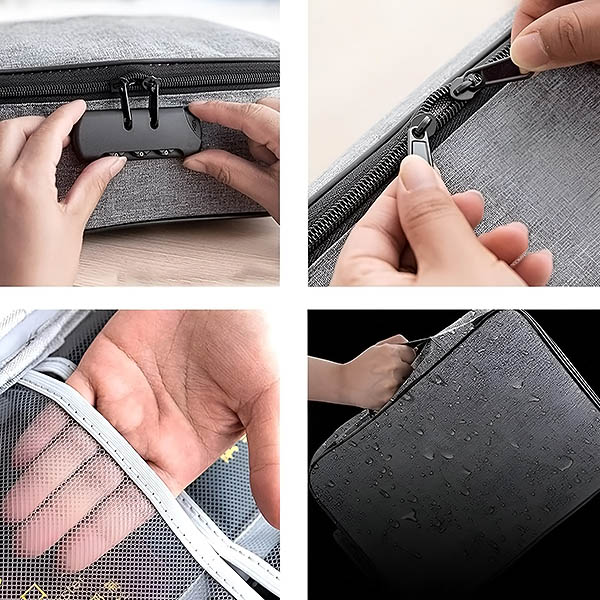 Bezorgd over de veiligheid van je belangrijke documenten en waardevolle spullen? Deze waterdichte tas is voorzien van een veilig codeslot, waardoor je documenten, geld en sieraden ontoegankelijk blijven voor anderen.