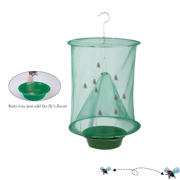 Vliegen worden op natuurlijke wijze aangetrokken door het aas in de bak. Als ze eenmaal in de val zitten, kunnen ze niet meer ontsnappen en sterven ze uiteindelijk door uitdroging en honger. Deze methode garandeert een hoge opvangsnelheid zonder dat er schadelijke chemicaliën nodig zijn. Verminder op efficiënte wijze de vliegenpopulatie in je omgeving.