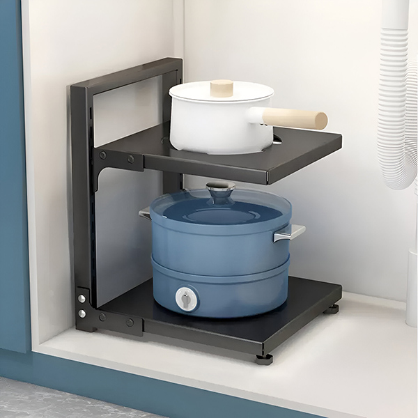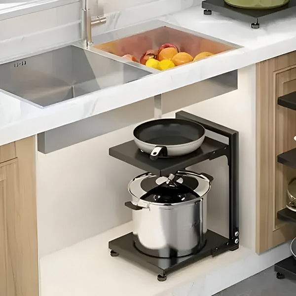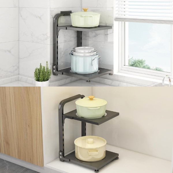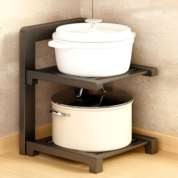 Organiseer je keuken met gemak! Deze pottenstandaard met twee planken is perfect voor elke kast en de ideale oplossing voor een opgeruimde keuken.