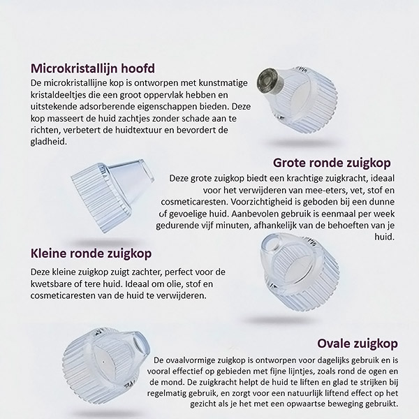 Het apparaat wordt geleverd met 4 verwisselbare opzetstukken, elk ontworpen om specifieke huidproblemen aan te pakken. Zie de onderstaande afbeelding voor meer informatie over hoe elk opzetstuk werkt!