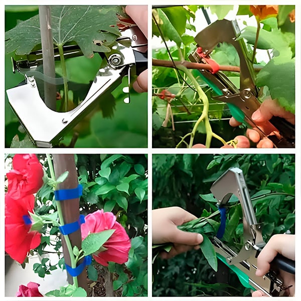 Druk gewoon op het handvat om de riem tussen de tang te spannen. Vervolgens wordt de tape om de plant gewikkeld die je wilt binden. Duw nogmaals op de hendel om het lint strakker te maken en door te snijden. Erg makkelijk! – je hoeft je geen zorgen te maken dat je je planten beschadigt of pijn doet, omdat de tape en de nietmachine een zachte maar stevige grip bieden.