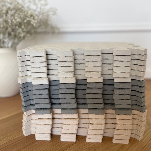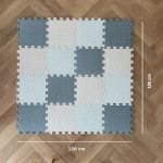30 × 30 cm schuimpanelen. De set bestaat uit 16 stukken (en 2 extra losse panelen). De totale afmeting van het tapijt is 2,5 vierkante meter en bedekt. Het kan worden gebruikt in verschillende kamers en zelfs buiten.