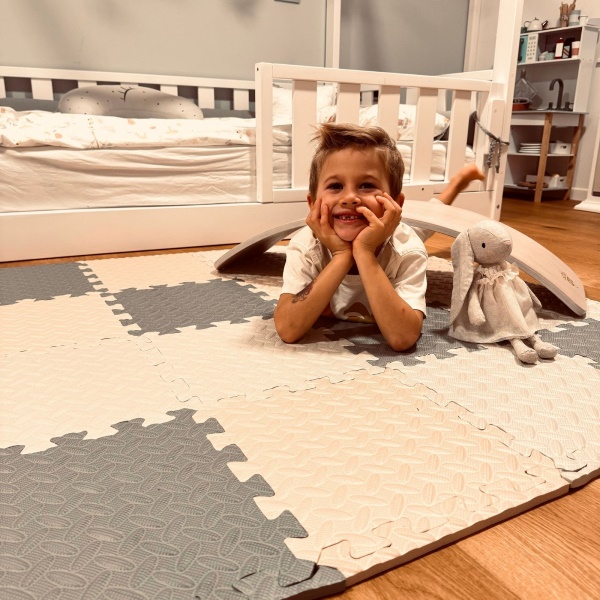 Gemaakt van hoogwaardig, niet-giftig EVA-schuim met een dikte van 1,2 cm om de veiligheid en het comfort van het kind te garanderen. Het voorkomt ongelukken door een eventuele val van de harde vloer te isoleren. Het oppervlak van de mat is waterdicht en duurzaam en heel gemakkelijk schoon te maken met een vochtige doek.