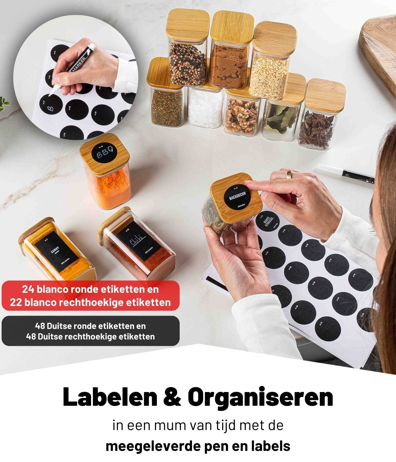 - LABEL JE VOEDING – In onze set potten met bamboe deksels ontvang je ook 96 labels in het Duits en 46 blanco labels om je te helpen nog beter te organiseren. We leveren er ook een krijtstift bij zodat je de namen van de levensmiddelen in de potten op de etiketten kunt schrijven.