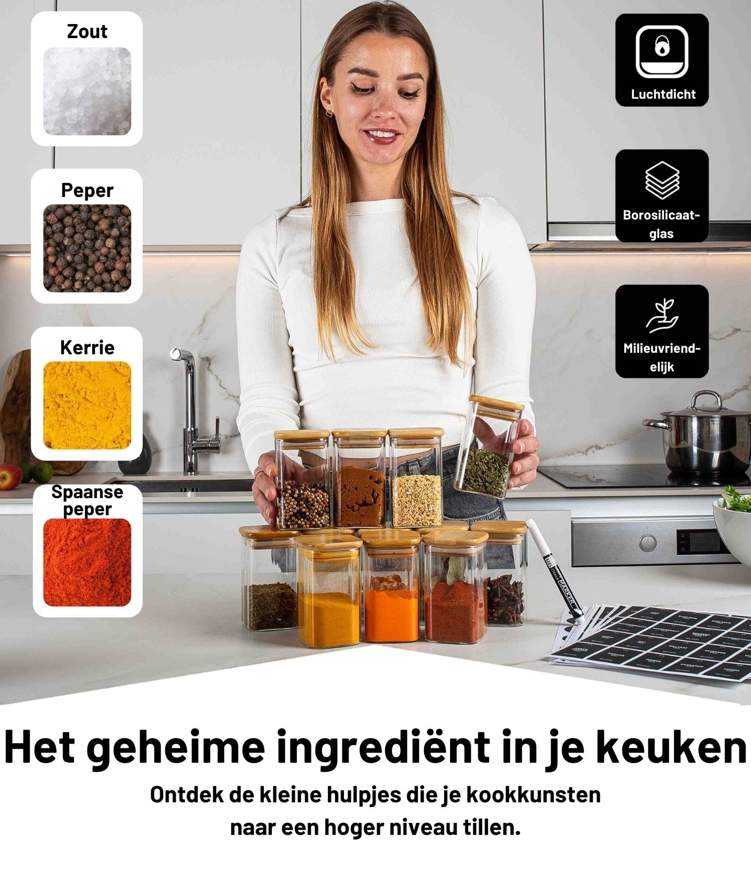 Onze set bevat 12 voorraadpotten. Ze hebben allemaal een diameter van 6 cm, zijn 10,7 cm hoog en hebben een inhoud van 280 ml. Dit maakt opbergen makkelijker en het ziet er elegant en uniform uit.