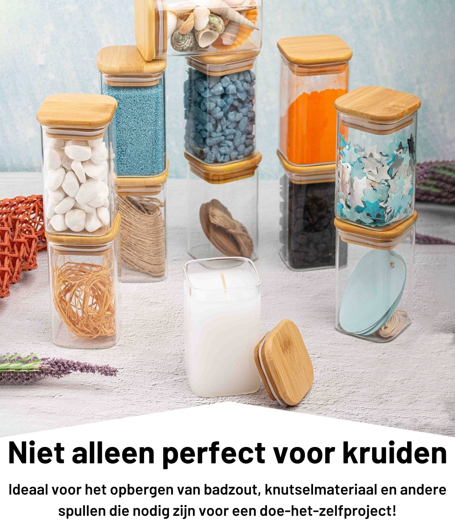 - OEDSELVRIENDELIJK, GIFVRIJ – Onze glazen potten zijn gemaakt van sterk borosilicaatglas en de deksels zijn gemaakt van organisch bamboe. De materialen bevatten geen BPA of lood.