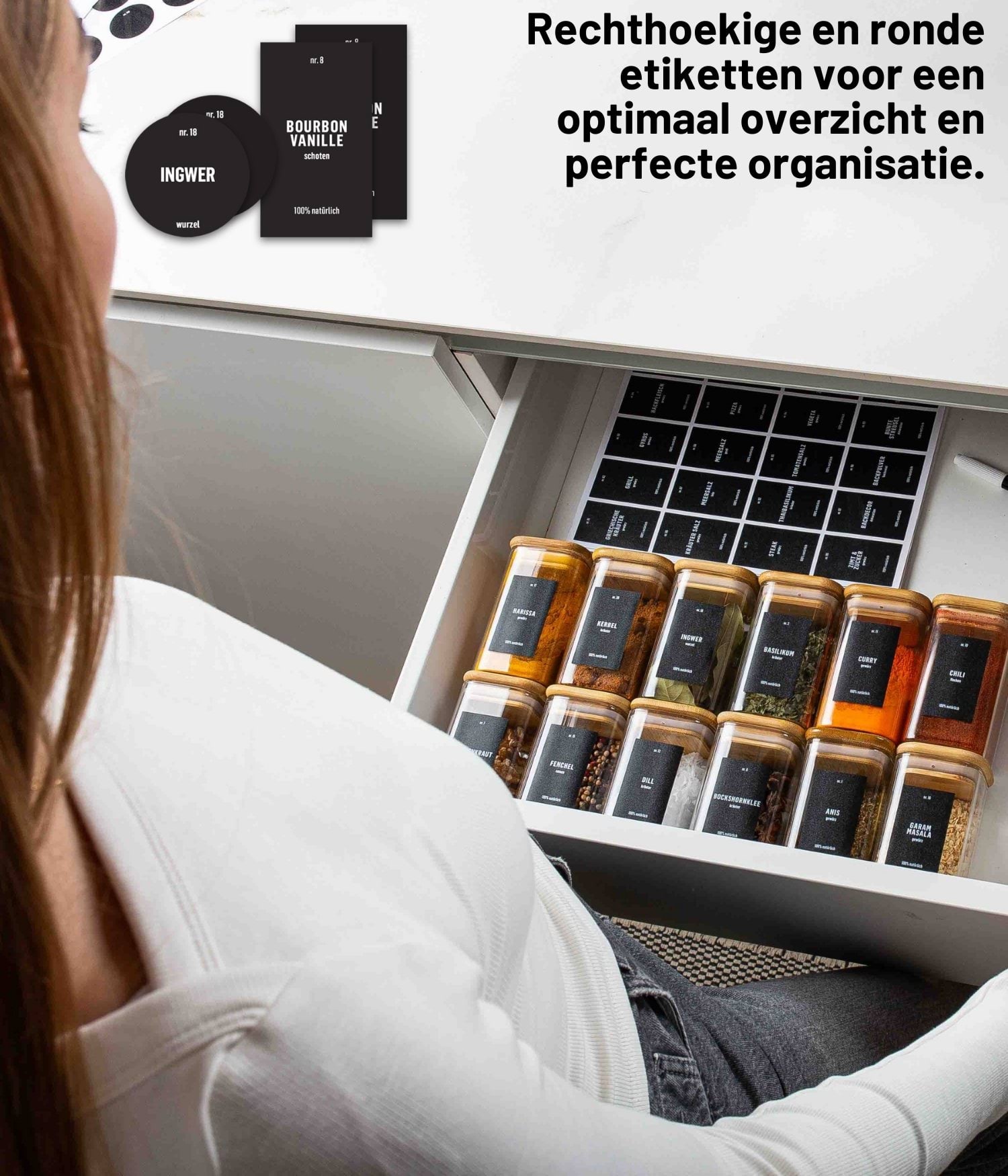 Naast de glazen potten ontvang je ook 96 etiketten in het Duits en 46 blanco etiketten die je kunt gebruiken om voorraadpotten, kastdeuren of kruidenrekjes te markeren met de bijgeleverde krijtstift. De etiketten kunnen altijd worden weggeveegd en opnieuw worden beschreven.