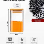 Onze set bevat 12 voorraadpotten. Ze hebben allemaal een diameter van 6 cm, zijn 10,7 cm hoog en hebben een inhoud van 280 ml. Dit maakt opbergen makkelijker en het ziet er elegant en uniform uit.