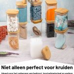 - OEDSELVRIENDELIJK, GIFVRIJ – Onze glazen potten zijn gemaakt van sterk borosilicaatglas en de deksels zijn gemaakt van organisch bamboe. De materialen bevatten geen BPA of lood.