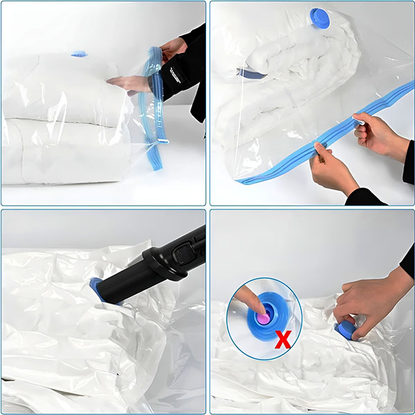 In slechts drie eenvoudige stappen kun je ruimte besparen in de kast. Doe je spullen eerst in een zak, sluit die dan voorzichtig en gebruik tot slot een stofzuiger of een pomp om de lucht te verwijderen.
