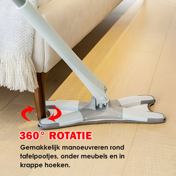 De buigzame, flexibele mopkop bereikt moeiteloos krappe ruimtes—onder meubels, achter toiletten, rond meubelpoten en in hoeken—zodat u dat niet hoeft te doen.